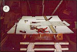 A little time with a hand jack plane and the beveling was done. [here is where buying tools at the right price pays off ; I've had this Stanley 14 inch plane, still in the box, for years. I paid less than $20 for it from a mail order close out.] Theoretically this could have been done with a block plane but it would have been a LONG JOB. The plies made a decent guide; keep them relatively parallel as you cut. Use a SHARP cutter. It's also nice to have a stable bench made from an old door and a piece of cheap Luan ply; you have no qualms about putting a screw into it to stop something from sliding.