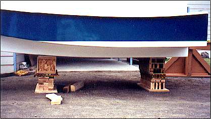 Here are four photos showing how I lifted Microtrawler to the trailer.  I bypassed the dry dock for now, because when I got it up on the second set of keel blocks, I chickened out.  I used a small floor jack to do the lifting.  I will, however, lower the dry dock and use it for refitting and painting later.  The keel blocks are made from construction site scraps, no cost.