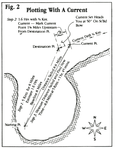 If you think there's a significant current running, mark the destination point and then lay the distance rule from that point in the direction exactly opposite to the current flow or set (Fig. 2, below). Current speed is called "drift," current direction is called "set." Say you glance at a buoy (or the tide and current tables) and estimate the drift at 3/4 knot and the set to be heading you at about 50 degrees on your starboard bow. You see on the distance rule that the baseline distance to your destination is 8 miles; and you know you're going about 5 knots. From Gerr's Nomograph, you find that it'll take just over 1-1/2 hours to go this course (8 miles devided by 5 knots = 1.6 hours). Using Gerr's Nomograph, you can also see that the current will set you off about 1-1/8 miles (3/4 knots x 1-1/2 hours = 1-1/2 miles). Simply mark a dot (current point) at 1-1/8 miles in the direction opposite to the current flow (upstream) from the destination point. Place the distance rule between the current point and the starting point. This gives the course to steer and the new distance, in this example, 8.8 miles. The new time - 1 hour and 45 minutes - can be determined from Gerr's Nomograph in a jiffy. To complete these steps only takes about 90 seconds.