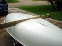 Finally I put a layer of fiberglass on the entire bottom which starts just aft of the trunk and goes to 6" from the stern.