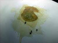 Here is a repair done in a hurry, I should have cleaned up the drips but had to leave it right after application. Several love bugs are trying to imoralize themselves by swimming in the epoxy, obviously they watched Jurrasic Park too many times. Came right off on the next sanding pass...