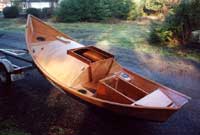 This boat started out as a primarily rowing craft, then the buyer added a small sprit sail rig and finally a motor well. The hull weighed less than 200 pounds before we added the motor well, which included liberal use of epoxy and fiberglass cloth on exterior surfaces, watertight storage and flotation compartments throughout, and two eight foot long twin keels for directional stability. The result of difficult choices and compromise in small boats such as this is obvious, as the efficiency of either sailing or motoring in a dory hull form may be questionable and it may do none of these things markedly well. However, the boat has packed a lot into a package less than 14 feet long, and promises to be lots of fun for overnighting and short trips on the water. Detailed building plans will soon be available from butlerprojects.com