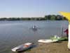 By this time it was well after lunch and neither Bruce nor Sue nor Amanda had eaten so they decided to drive around the lake and find some food and suitable potables. Ted had to leave early for family business. There I was, left guarding the boats when my wife Pat showed up. Since it was quiet she talked me into taking my own boat out for a sail while she watched the boats. I'd recently rigged up a tiny balanced lug for "Eileen" with kick up rudder and removable leeboard and wanted to try her out in the afternoon breeze. I thought I'd sail over to the Marina, about half a mile away, and bring back some cold drinks. Heck, what could happen while I was away? Lots, I found out, when I came back. click to enlarge