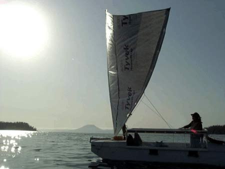 Handling our Crab Claw Rig took some getting use to, but is very simple. Hauling the tack downhaul raises the sail to more vertical attitudes, slacking allows it to recline. The leeward sheet is the ‘active’ one, hauling its limb down and in. Then the windward sheet is hardened as a stay on the upper limb. There’s no reefing, per se... just roll the sail toward horizontal, directing force upward and converting heeling moment to vertical lift. The limbs spring inwards to absorb the shock of gusts.