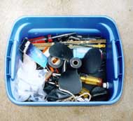 click to enlargeMisc. items: spare boat plugs in the (2) different sizes used on my AF4: extra batteries (AA size) for the little flashlights that I have onboard, a starter rope to be used if the recoil starter on an outboard fails, electrical tape, teflon plumbers tape (used to seal the threads on the cheap plastic garboard drain plugs I installed on the AF4), and a pill bottle containing some spare hardware for the bimini top.