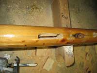 So the first step was to use the sheaves themselves to mark the mast. We don’t need to remove any more wood than is necessary. Note that the old hole corresponds to the top of the sheave, not the center.