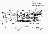 Hull shape has plenty of shape : strong flare, a springy sheer, and sides that twist as they run forward to the stem. A robust stem protects the edges of the plywood and impart a traditional appereance, as do the decorative sheerstrakes added along the upper edges of the side panels