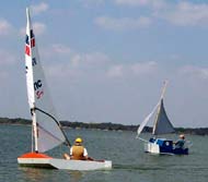 With the preliminaries out of the way, Jason, John, and Neil set forth to do battle. It was interesting that, with only three boats, we had illustrations of nearly the entire range of Puddle Duck Racers that currently exist. Neil's Myrtle is as close to a "standard" PDR as exists, a basic plywood box with side air boxes and a leeboard; its distinguishing feature is an offset mast, mounted in the starboard air box. Jason's Sea Flea is the most elaborate, and prettiest, PDR to date, and the only one with a cabin that I know of. John's Q&D is arguably the most technically advanced boat in the fleet, with an more-or-less monocoque hull and sides extended down into bilge keels. It looked to be an interesting race, though it was acknowledged that Jason and the Flea had a significant weight disadvantage.