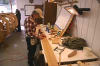 click to enlargeEd is checking to ensure the pattern as drawn on the 3/8-inch cedar planking stock is roughly fair. It doesn't need to be perfect at this point, because we will carefully fit the plank to the boat after it has been cut out and steamed. The construction diagram for the skiff is taped to a piece of thin plywood and propped up on a bench for easy reference by the student boatbuilders.