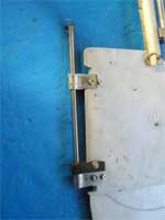 In the photo (Left) above I show the stainless steel mounting plate that was bent in my shop using my vise as a bending brake. The aluminum kickup rudder is the gray object on the right. A stainless steel shaft goes through the entire object holding the rudder to the mounting plate. The second screw up from the bottom locks in a piece of neoprene rubber that is ½” thick with a hole the diameter of the shaft. This prevents the shaft from coming loose under any condition even when turned turtle. The tiller being directly above this shaft also prevents this pin from coming out unless the tiller is raised past vertical. The bolt shown in the photo below secures the mounting bracket on top and below. It goes through the original shaft hole.