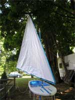 While the mast is in view, let me discuss what I did to modify it. In the above photo I used a 12” tube at the masthead in place of the regular 8’ inner tube. What you don’t see is that I reinforced the 8’ mast with two 5’ hardwood spade replacement handles that were spliced together and cut to the remaining length of the mast (7’) These handles were exactly the proper diameter and were held in place by the bolt holding the halyard cleat. Now there is no flex in