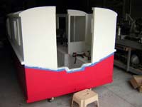 Using white latex primer I splashed a coat on the upper half of the outer hull and inside the cabin. After this cured for several days, I then applied three coats of Sherman-Williams A-100 External Latex House Paint to the outside top half of the hull. I have used this paint for over 30-years on my house's wood trim, and it has held up great under very adverse Oklahoma weather conditions.