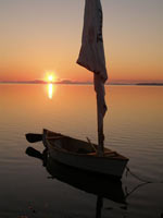 Friday threatened thunderstorms and let loose a downpour during the afternoon. So much for sailing the seven miles from Pepin. About 6 the weather let up, including the wind. The boat was slid in the truck and ready to go. I was in a quandary; drive to Lake City or go up the road to Stockholm, hoping to find help to launch and leave the the truck there for two nights. My wife got home at 6:30 and rode along to Stockholm. Barely breeze to clear the shore and pier. Better out from under the bluffs. Had a leisurely sail across to Hok-Si-La, meeting a couple more Messabouters on the way. Perfect for my first sail in many years.