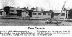 I have attached a copy of a newspaper clipping of my father Ed winning a race in 1933 and a picture of Maurice's punt the "After U." The picture shows a type of boat locally called a " sailing punt" common to the area having sailed on the Bay of Quinte for over a hundred years. The clipping shows the crew member hiking out on the hiking board (read plank) to keep the boat upright. On windy days the larger the person the better were his chances of crewing that day. If you look closely you can make out the oar that was used to steer the boat, everything about the boats was simple and cheap. The definition of a punt is a flat bottom boat with square ends and this description certainly fits the Quinte sailing punts. The boats raced in several classes but all boats were made by the owners, sails were obtained from various sources for example, some were re-cut from old schooner sails, made from canvas remnants from various sources.