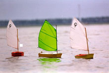 In the Netherlands, three Optimist dinghy models keep company, the photograph I believe taken by Hans Staal, below that left, a  Robbe model of the schooner Valdivia with builder/owner, Robin Harker and over on the right, a Thunder Tiger Victoria called Fear Knot, owned and sailed by Dave Klingman of the Clearpoint Model Yacht Club in the USA, it’s name as enterprising as its somewhat stunning  paint job.