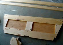 The keelson was another piece that needed to be a little longer than 16 feet. Because of the stress in this area near where the transom attaches, I used a stepped joint with reinforcing blocks, all buttered with epoxy and fortified with glass tape.