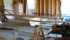 The boat began to take shape as the longitudinals were bent around the mold and fastened to the transom.
