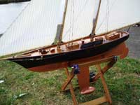 Asked to restore it, Geoff originally declined as the deck of the model was badly split and the hull was only barely sound. and requiring of extensive work if the model was ever to sail again. After much sanding back and extensive work by John, his request to fit radio control could not be ignored by Geoff who undertook to help on a `beer for work done’ agreement. With new sails, a quarter scale Hitec rudder servo and a Hitec sail winch, the construction and fitting of bulwarks and new brass fittings, the old yacht now renamed The Henry Grant, sails again.