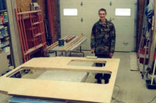 The walls, cabin top and fly bridge were made with ¾” ply. for studs and joists then ¼ Baltic birch ply. was glued and screwed and 6 oz. cloth was applied to the exterior with West System epoxy. All wood was sealed with epoxy.