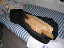 In the summer of 2006, I disassembled the packable boat in preparation for my vacation. I packed the boat, along with extra fasteners, ropes, and bungee cords into a flight cover for a golf bag. This was checked as baggage on a flight I took to Bermuda to visit friends. The bag and all its contents weighed about 40 pounds. On my arrival in Bermuda, I was asked what was in the bag, as it was obviously not a set of golf clubs. I told the customs agent, "It's a boat." To this he replied, "Oh, I've got to see this." The boat was reassembled at Nine Beaches Resort. This caused a small stir as word got around that a guest at the hotel was building a boat.