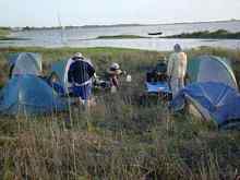 We spent Day 3 hunkered down. As the rain finally cleared we visited the lighthouse and interpretive center, but the winds continued to blow. Some of the guys were out of dry clothes. Their tents had leaked during the night. My motor had fritzed out. I worked in knee deep water to pull off the carb, and Bill, the head of the Moffitt clan made up a wire and cleaned the jet. Tony took good care of me as well. He charged my GPS from his main batteries and gave me fresh gas for my motor. Later he grilled me a hamburger, saving me from another freeze dried dinner. And yup, much to my surprise, the motor fired up.