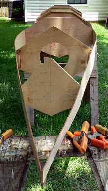 The bilge panels are deliberately cut oversize. Here, they are temporarily fitted and marked for final cutting. |
