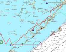 (in 2010, I tacked only once after passing Bowlegs because of that shift). But this year, the easterly was caused by a high pressure system off the U. S. coast (so the weather radio said), which is why the winds were stronger than normal. It also overrode the normal favorable shift of the sea breeze. We couldn't do 64 degrees; the best course was around 45 degrees. A short tack was even necessary to make Bowlegs, which was reached just before 4 p. m.