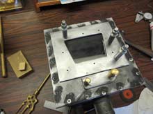 Here you can see the draft control I made. The knob on the left is made of a piece of brass drilled and tapped to accept a 6-32 screw which is installed in a countersunk hole from the back of the piece so it can slide across the front easily. The right knob is drilled and tapped for a 10-32 screw that protrudes from the inside of the stove though a tapped hole. To adjust the draft I loosen the right knob and move the control to the desired position, and then tighten.
