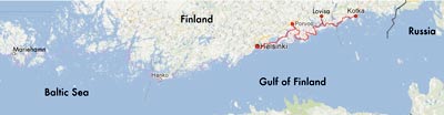 Arrived last night from Pennsylvania via Toronto, Frankfurt, Helsinki by plane and Kotka by bus. Launched the boat on a borrowed trailer in Kotka’s main harbor, and motored up to a small creek north of Kotka for the night. It is windy, choppy and cold, and will take several days to overcome jet lag, get my sea legs and warm up.