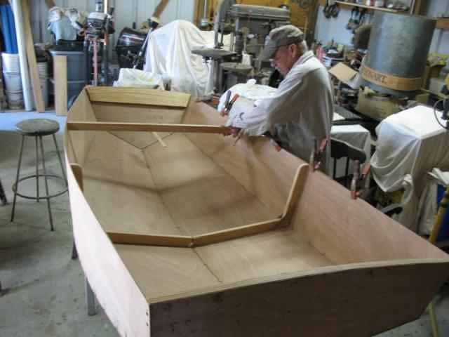 I'm building a storage compartment in bow of dinghy, which isn't on plans, so every thing has to be built "in place". After much measuring, re-leveling, re squaring, etc, a pattern was made from heavy cardboard for the cross ways (thwartships) bulkhead. |