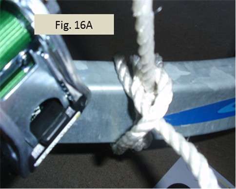 Fig. 14 shows the first step to make the clove hitch tighter and more secure. First, I take the tail coming out of the clove hitch (the tail is hanging down in Fig. 13) and feed it under the trailer beam and then back over the top toward me on the right side of the pulling line that comes down from the ratchet knot. Next, I take the end I am holding and feed it over the top of the trailer beam on the left side of the standing part. I let the tail drop behind the trailer beam so I can reach under and grab the line and pull it back toward me from under the trailer. In effect, I’m forming a rope collar around the standing part. This is a “collar lashing” that when pulled makes the line coming down from the ratchet knot much tighter.