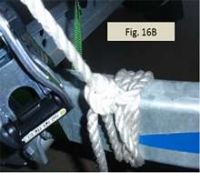 Fig. 10 shows the first stage of forming the modified garda hitch. The working end is led from the bowline knot down around the trailer and then back up to the bowline knot to be fed through both rope loops. Our plan to complete the garda htich is as follows. Before leading the working end back down to the trailer a second time to be tied off as occurs in a conventional truckers hitch, we’ll first feed and wrap the line through the bowline one more time. But instead of feeding through both loops as shown in Fig. 10, the second time we’ll bring the working end down between the two bowline loops as shown in Fig. 11.