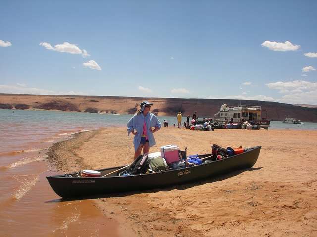 Chuck Leinweber invited me to join a group of folks at Lake Powell in June. This messabout has been going on for years and is commonly referred to as the Kokopelli cruise. I planned on getting my Michalak designed shantyboat, “Shanteuse”, finished in time for the messabout, but was unable to complete it by then. So I purchased a canoe a couple of weeks before the trip, and my daughter Cathy joined me for the adventure. I was nervous about the trip as I had not paddled a canoe in years; and that only for a brief hour on a secluded creek. Capsizing the canoe during the trip was my biggest concern, but we never did.