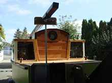 Nobody ever accused me of being a photographer. I haven't let that stop me and present here some snaps of my efforts this summer. The roof and hatches came first. They should have probably followed the tabernacle, not preceded it. However, I didn't plan on a tabernacle until the mast snapped, but that's another story. I'll get back to that later. The roof and hatches were constructed of cedar strips a la stripper canoe style with cove and bead edges. The hatches were constructed first as one large piece and then the roof section was built on top of it to get the mating curve. Next the hatch was cut into two equal length pieces. The hatches slide on aluminum angles fastened to the slot top rails. The roof is fastened with hooks on one side and loose pin hinges on the other rail. It is removable. The black coloured gaskets between the roof and the hatches were carefully designed by General Motors and came from a 2002 Oldsmobile that was languishing at Ralph's Pick-A-Part. They started life as weather strip around the doors and have proven to be effective on a boat as well.