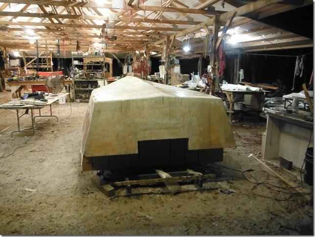 This thing looks just like a giant Core Sound, maybe I should put a big sail on it. All of this glassing and grinding and filling and sanding and sanding was a lot of work but as you know I actually like to sand if I can use power tools. All of this from start to finish took me just a week to do. I like to go out to the shop after dinner and work from about 7 to 9 which eliminates a lot of waiting for epoxy to dry if I do it during the day. Now to start the inside. More make it up as I go along.
