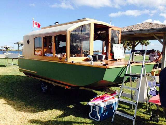 Several small miracles occurred on this trip, "she'll be the queen of the ball" Chuck's invite said! He must know my ego! Unfortunately there seemed no way we could make it. Too far, too expensive and our tow vehicle was too old. We would be traveling from Wasaga Beach, Ont. Canada! Dianne agreed it was a definite no! I recently took the leap from a good paying career to build boats to my own design! I could not let the idea of this show go, however, what better way to get some momentum in a new career than to take my first boat design to a festival that appreciates Ply boats! The houseboat has been well received by many magazines and the people may enjoy seeing her. Meeting like-minded people, to share some tricks of the trade, would also get me off to a running start! Having a friend or two myself, one heard the news of this opportunity and thought I should go, he insisted we use his 2014 van as the tow vehicle (no I did not beg)! This small miracle is why a definite "no" became an enthusiastic "yes"! I ignored the cost and the fact that I didn't even know if we could take our boat across the border! I quickly notified Chuck that we'll be there, not mentioning this small wrinkle. Three weeks to go before the show and we began preparations.