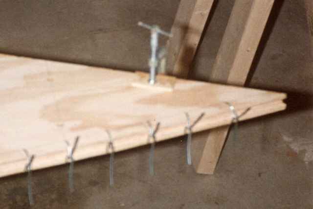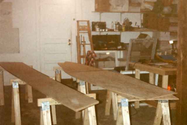 Most of the construction photos are fuzzy, because they were taken with an old 110 film camera at night in my poorly-lit garage. A few years later I added more lighting, and since then I need even more. These are the 3/8-inch fir plywood sheets being joined to make the blanks for the side and bottom panels.