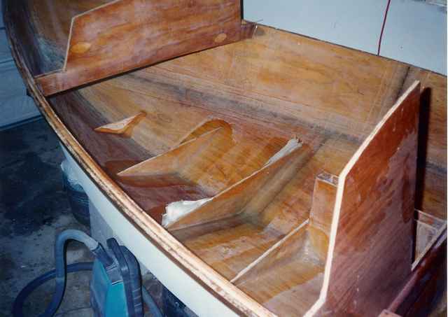 I remember really tiring of taping and glassing by this point in the project, so I took a break to do some woodworking. Devlin's drawings showed the cockpit seats with two wide slats per side, but I thought the narrower park bench slats looked better. This doesn't provide any enclosed cockpit storage or floatation, which is an inconvenience and a concern. For another boat I would really have to weigh what to do, because these seats look so much nicer than plywood or cushions, and they are comfortable.