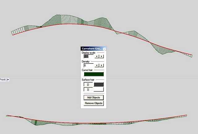 This is a picture of the chine in plan and profile view, created directly from the table of offsets but with some points corrected because of flagrant deviations. The curve graph shows how unfair the curve is without editing. We can create and fair the lines in 3D but there is a better method.