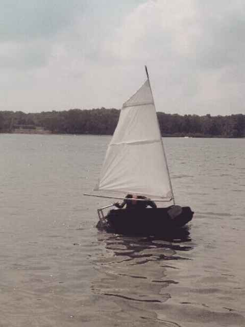 The boom needs to be aluminum tube, clew needs better lashing, but course holding and way on in wind from sparrow flying across lake. |