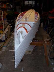 Fore and aft decks added (they stiffened up the boat wonderfully). A ¼ by ½ inch strip of oak (recovered from old kitchen cupboard doors) was bent using a hot air gun and glued in place to act as a backrest.